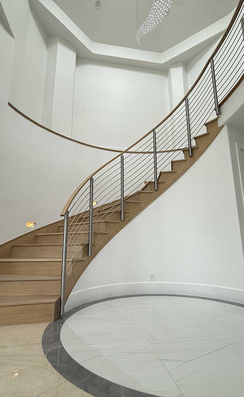 We proudly offer in-house expert carpentry and welding services, allowing us to create a variety of custom features that traditional construction companies typically cannot provide. The curved railing shown on the right was handcrafted from white oak and stainless steel, with each rod individually bent by hand to achieve an exceptional level of luxury, precision, and craftsmanship.